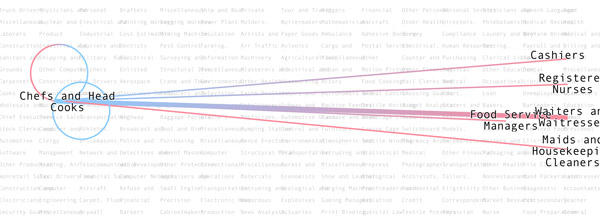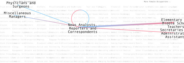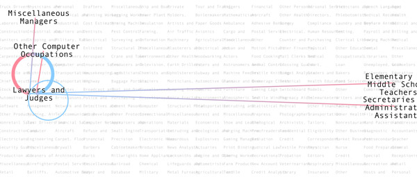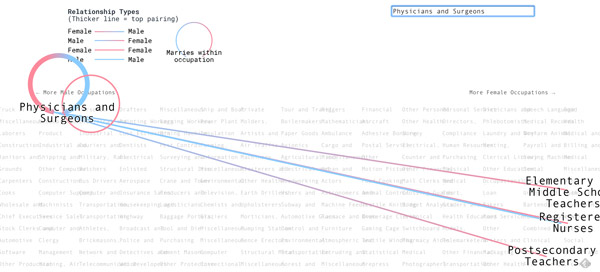 紅色代表女性,藍色代表男性,直線表示不同行業(yè)人之間的婚姻關系,圓圈表示同行結(jié)婚。以下圖片均來自Bloomberg。