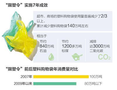 2月17日,人民日報發(fā)文回應稱“限塑令”實施以來效果明顯,超市商場用量普遍降低超過2/3。國家發(fā)改委環(huán)資司稱7年間共累計減少塑料購物袋140萬噸左右,相當于節(jié)約840萬噸石油、節(jié)約煤炭1200多萬噸、減少二氧化碳排放近3000萬噸。