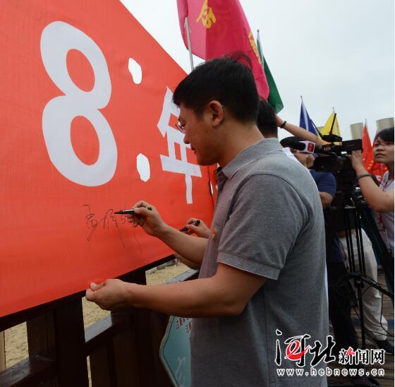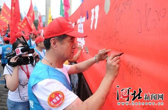 7月1日,接力沈汝波,為民做好事2018年北戴河最美旅游旺季志愿服務(wù)活動(dòng)啟動(dòng)。圖為志愿服務(wù)者代表在條幅上簽名。記者孫也達(dá)攝 游客的困難就是志愿者的困難、秦皇島的困難,決不讓